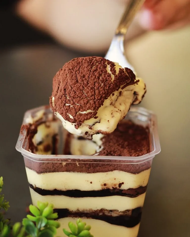 Creme mascarponi, bolacha champanhe, banhada no vinho do porto, licor de cacau...